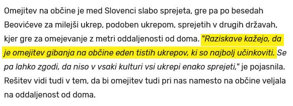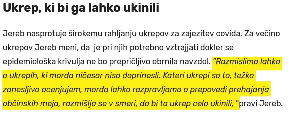 Povsem razumljivo – stavek sem namenoma napisal na način, ki nazorno pokaže, kako strokovnjaki državljanom predajajo informacije in navodila. S stavkom sem želel povzeti dve nasprotujoči si izjavi strokovnjakov iz vladne svetovalne ekipe. Tako je infektologinja dr. Beovićeva izjavila, da je prepoved prehajanja občinskih meja eden izmed učinkovitejših ukrepov. Skoraj istočasno pa je vodja Oddelka Intenzivne terapije Infekcijske klinike, dr. Matjaž Jereb, isto prepoved označil kot ukrep, ki ni doprinesel ničesar in bi ga veljalo ukinit. Gre za zelo nejasno sporočilo javnosti, kako resno moramo ta ukrep upoštevati in obenem za zelo jasno sporočilo javnosti, kako dvomljivo je lahko strokovno mnenje.