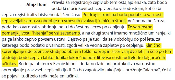 Čeprav se z zatrjevanjem o varnosti želi povečati zaupanje do novih cepiv, lahko v izjavah domačih strokovnjakov med vrsticami razberemo tudi določeno stopnjo negotovosti in pomislekov. Tako na primer dr. Ihan v članku za RTV Slovenija pomirja, da so nova cepiva varna, saj ostajajo pravila za registracijo enaka kot prej. V naslednjem stavku pa opozarja, da se bodo podatki o varnosti nanašali zgolj na razpoložljive podatke, kar v tem trenutku pomeni le za obdobje 3 mesecev in da se bo prejemnike cepiv spremljalo še vsaj dve leti z namenom, da se določijo dolgoročni stranski učinki.