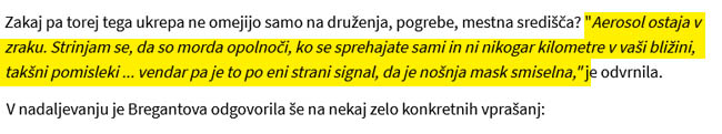 Potem pa smo v drugem valu prišli do spoznanja, da se virus vendarle širi preko drobnih delcev razpršenih v zraku, tako imenovanih aerosolov. Ti drobni delčki pa ostanejo v zraku suspendirani dalj časa in prepotujejo daljšo razdaljo. Seveda sta ob tem postali jasni tudi dve zadevi – uporaba kirurške maske ni učinkovita pri zadrževanju teh delcev in verjetnost za prenos okužb na prostem je zelo majhna, saj se koncentracija teh virusnih delcev na prostem zelo hitro razredči. In kaj smo naredili mi ob tem spoznanju? Uvedli smo obvezno nošenje mask (neučinkovito glede na študijo) tudi na prostem (nepotrebno glede na študijo). Obveza je veljala tudi, če bi se človek sam sprehajal po ulici opolnoči.*******