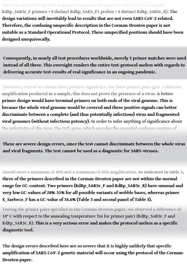 Znanstveni članek objavljen konec novembra 2020 ponuja kvaliteten in kritičen pogled na temeljne nepravilnosti v članku, ki je začrtal osnovne smernice za zasnovo PCR testov za ugotavljanje prisotnosti virusa SARS-CoV-2. Avtorji zavzamejo stališče, da so takšni testi neuporabni za nadziranje poteka epidemije, saj se z njimi ne da razlikovati med aktivno okužbo, kjer je posameznik še kužen za ostale ljudi in prebolelo okužbo, kjer posameznik več ne more okužiti ostalih ljudi. Prav tako je kombinacija uporabljenih oligonukleotidnih začetnikov (angl. ‘primer’) neustrezna, saj posledično pomeni premik k večjemu deležu lažno pozitivnih rezultatov.